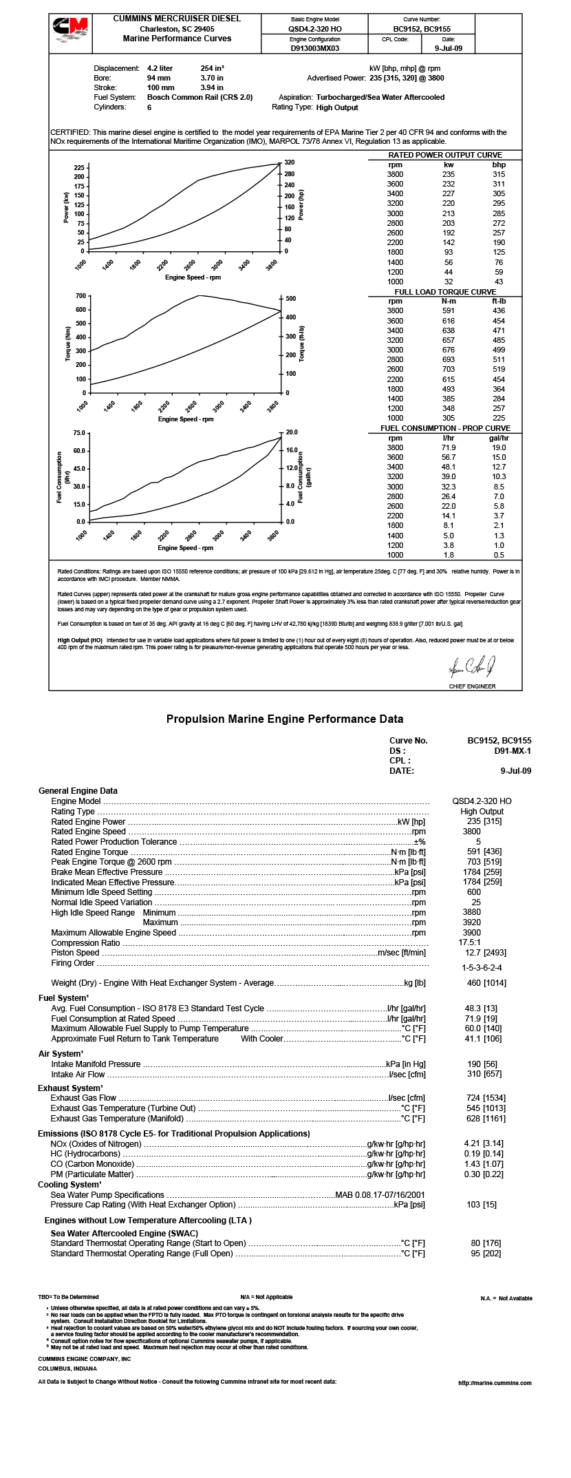 認證: This marine diesel engine is certified to the model year requirements of EPA Marine Tier 2 Per 40 CFR 94 and conforms with the NOx requirements of the International Maritime Organization(IMO),MARPOL 73/78 Annex VI,Regulation 13 as applicable. 排量: 4.2L