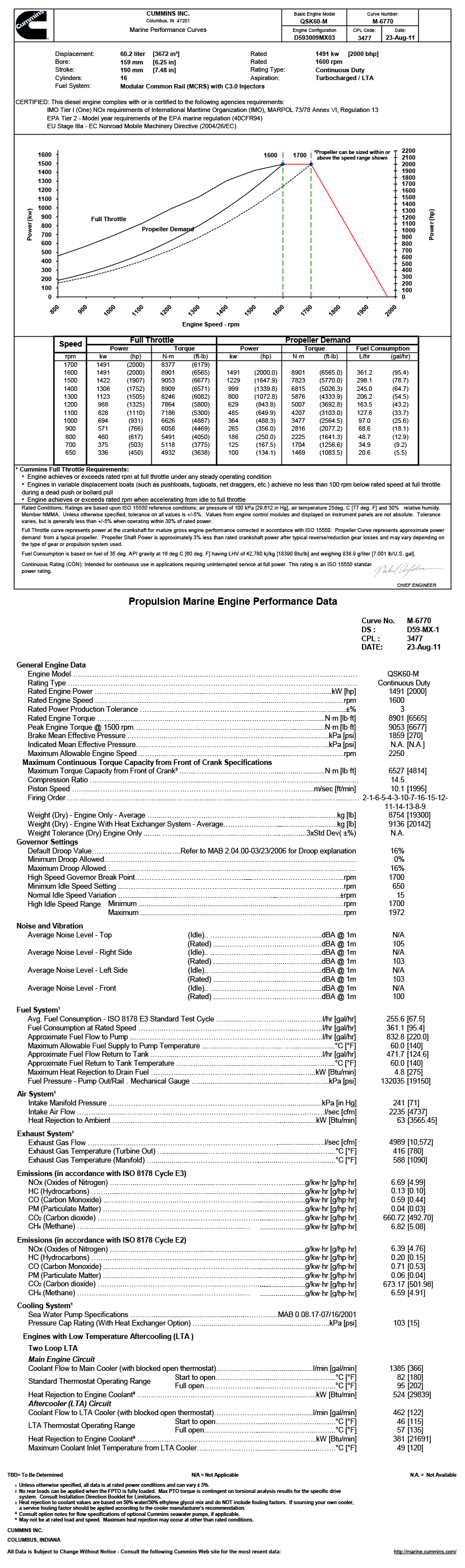 進氣方式: Turbocharged/LTA 最大扭矩: 9053N.M(轉速為1500rpm下的最大扭矩)