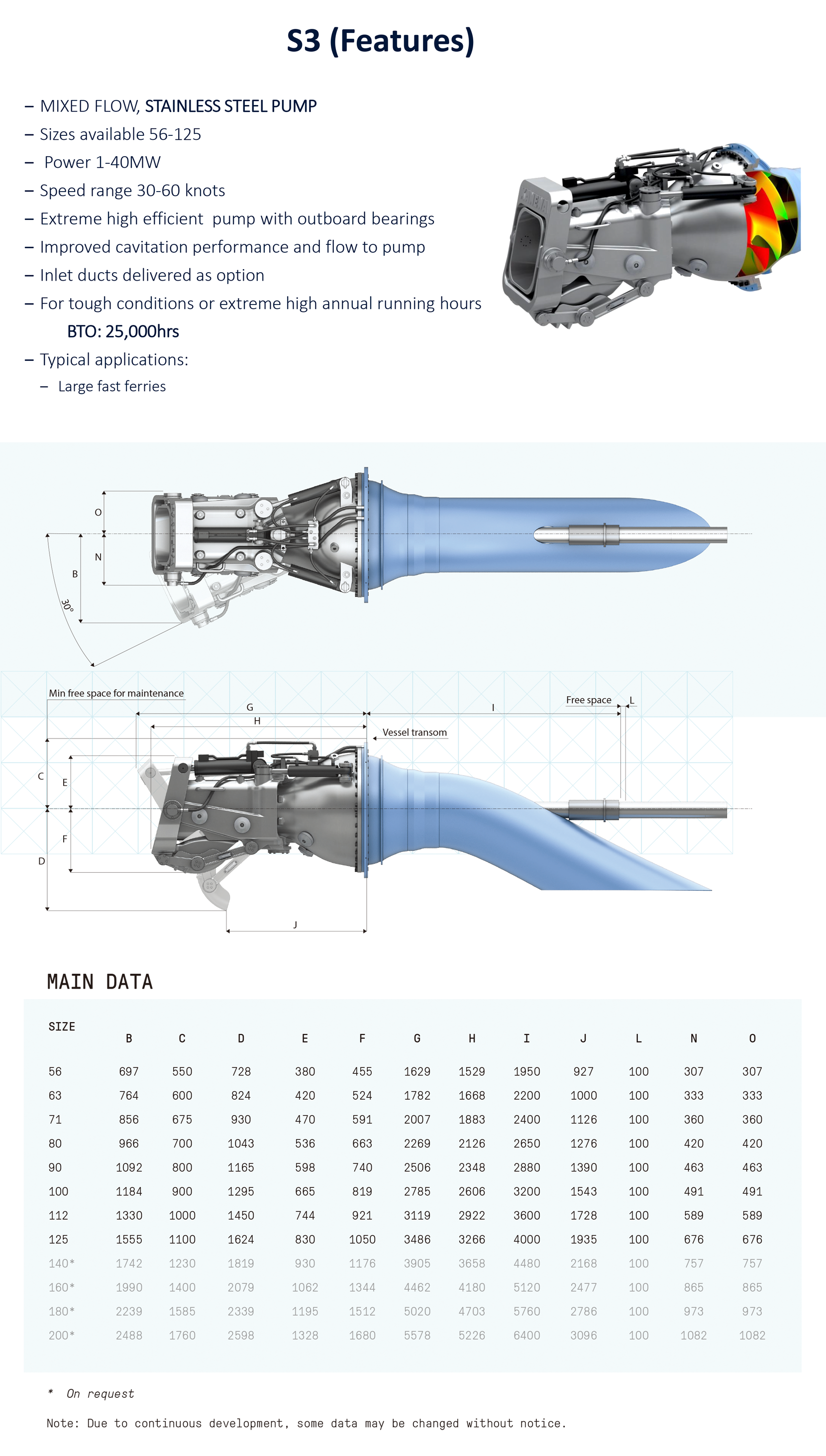 | 性能亮點: | ·Developed for the largest and most demanding applications ·Extreme high efficient pump with outboard bearings ·Improved cavitation performance and flow to pump ·The best possible durability under any circumstances, for tough conditions or high annual running hours up BTO 25, 000hrs or 5 year time service/replacement of wear parts ·Long life and reliable service ·Increased bollard pull capability closing the gap to conventional propulsors ·Optimal performance and hull stiffness when building in FRP |